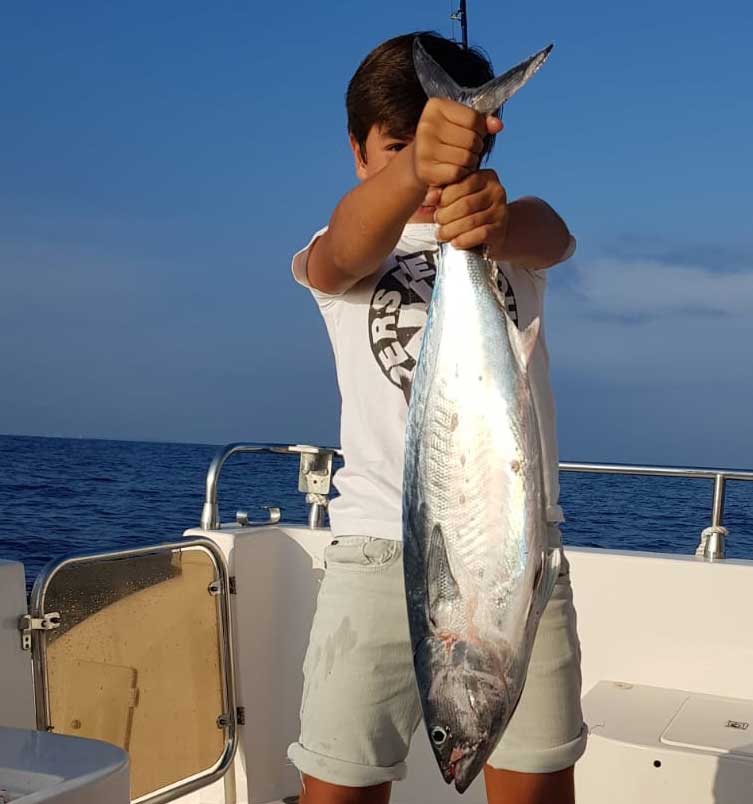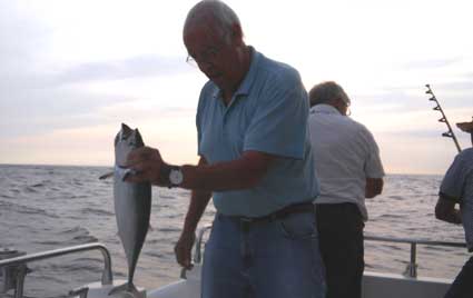 El día 24, unos días despues de la pesquera que va a continuación, volvieron al mismo caladero Esta vez el protagonista fué un nieto de Miguel Cuervo (Pinche imagen para ampliar) logrando unas pocas bacoretas de kilo y esta de 5 kilos VEA VIDEO DE SU CAPTURA |