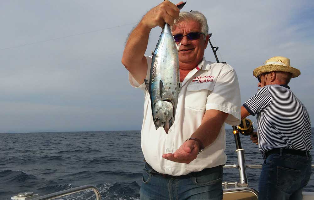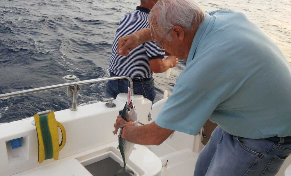 Arriba a la izda, el patrón Miguel, desenganchando una bacoreta que entró a un pulpito. A la derecha. el autor luchando con una buena bacoreta |