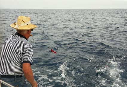 | Ariba, Vicente, abatiendo dos buenas bacoretas.Observen los 2 tipos de excitadores que utilizan a distinas distancias del barco y pescando en superficie . En el centro de la popa va otro aparejo que pesca a mas profundidad dotado de un plomo de medio kilo |