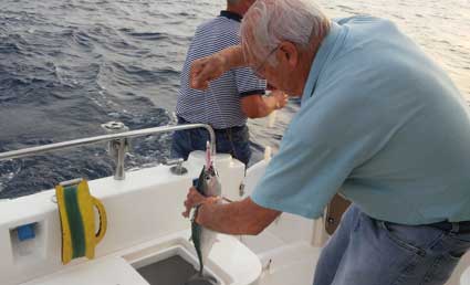Una vez a rumbo, empezó a bombear, pero observó que los aparejos iban cruzados. Retiró rápidamente la caña y aparejo de babor que iba sobre el de la picada, y así logró retirarlo sin enredos, y sin excesivo problema.