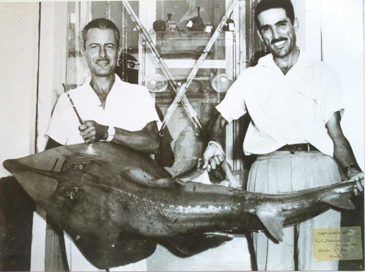 de Genoves y Pascual del Riquelme, con una reja o guitarrón de 17 kg y cerca de 2 m de longitud, lograda en aguas de Cabo Roig, pescando con caña desde tierra, en 1958 Pulse aquí