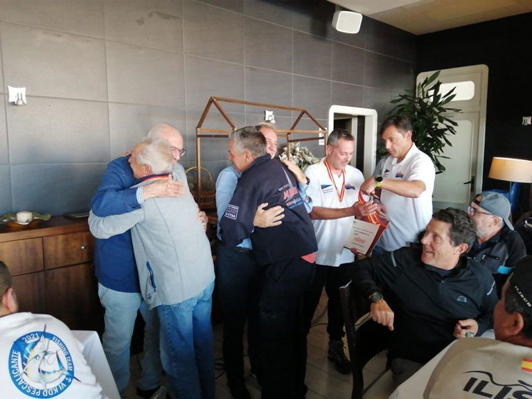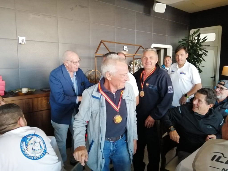 Arriba Vicente, compañero de Pesca de Miguel Cuervo, recibe una medalla por clasificarse en tercer lugar en el Concurso I Open de currican. A la derecha Vicente condecorado |
