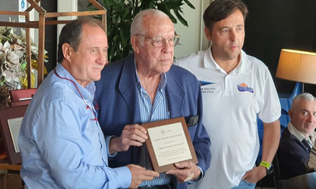 Miguel Cuervo, expresidente del Club Nautico de Santa Pola (en el centro), recibe una placa del Presidente actual Pascual Orts. A la derecha el actual Vocal de Pesca José Martinez, gran pescador también, y que es el actual dueño del Madroño IV .En Pescas Relevantes pueden ver una de sus capturas de dentones, al curricán, a bordo del Madroño IV |