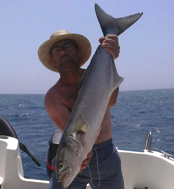 Palometón que pesó poco más de 14 kg, que el domingo 12 de junio pescó Javier Valdés a bordo del CuchiCuchi en 25 m de agua frente a Cabo Roig al curricán de fondo con jurel vivo. |