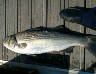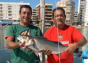 | Preciosa lubina o llobarro (Dicentrarchus labrax), pescada por Melgarejo pescando con cebo vivo , un raspallón, "a la ronsa" o deriva. No la midieron, pero estimo que debe estar entre 71 y 75 cm. La estimación, como es lógico aproximada, la hago por el tamaño mano/pez cuando éste, como es el caso, está en el mismo plano que la mano. Según Eduardo Melgarejo, hermano del afortunado pescador, pesó 7,800, por lo que debe ser un ejemplar mas obeso de lo común. Le he solicitado una foto midiéndola para averiguar si realmente es un récord local , contrastado de este modo.