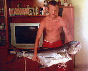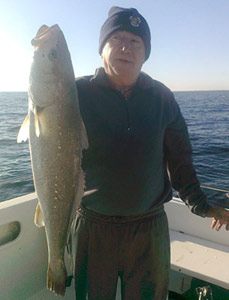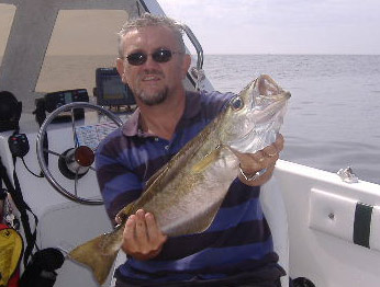 A la derecha Ronan a bordo de su embarcación TIGER con un abadejo o Pollock .El abadejo ( Pollachius pollachius ) es un pez teleósteo marino de la familia de los gádidos . Es similar al bacalao y mide entre 70 y 80 cm , aunque puede alcanzar los 120 cm y llegar a pesar 10 kg . Tiene el vientre claro y el dorso verde oliváceo con tonalidades pardas. Es habitual en el golfo de Vizcaya y, en general, en todo el Atlántico norte y oriental. (Tomado de Wikipedia)