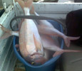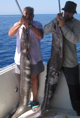 | Congrios de 29,5 kg y dos metros de largo y otro de 20 kg y 1,70, capturados por David Terres y José Manuel Menarguez a bordo de Pataty, pescando en 230 m de sonda, a 24 mn. de Torrevieja, usando de cebo alacha y calamares enteros. Las edades aproximadas están entre los 18 años para el de 29,5 kg y los 15 a 16 para el de 20 kg . Para ver mas detalles de la pesca del día pulse aquí |