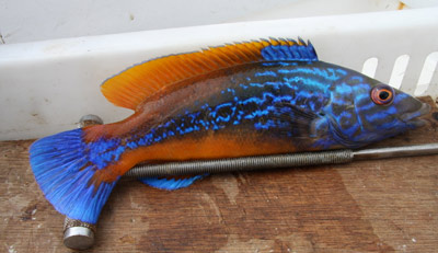 Coloración diferente según los sexos: machos, cabeza y parte anterior del dorso marrón, con líneas y manchas azules, vientre anaranjado; hembras, anaranjadas por el dorso y los flancos, con el vientre blanquecino amarillento, y tres manchas negras en el dorso, dos en la base de la parte blanda de la aleta dorsal y una en el pedúnculo caudal . Hasta 40 cm de longitud.. Existe también en el Mediterraneo aunque es rara su captura |