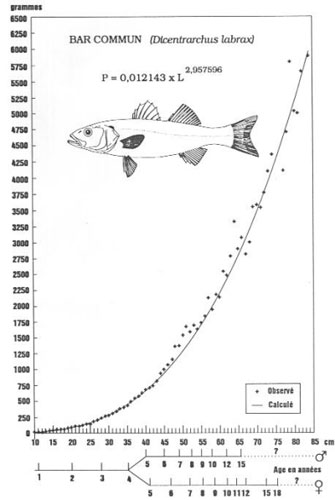 Han sido capturadas lubinas en su medio natural de más de 20 años de edad y se cree que con la presión de pesca actual el límite de crecimiento está en la talla que la lubina alcanza cuando cae en manos de algún pescador.