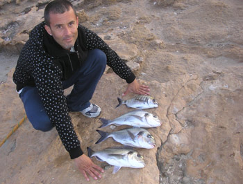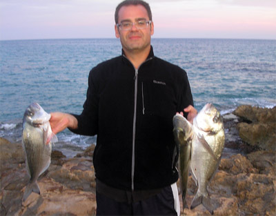 Adjunto te envío las fotos de nuestra última cosecha. Son 3 doradas casi idénticas de entre 1,300 y 1,400 kg y un sargo de 780 gramos. Tuvimos un día perfecto en lo climatológico y por suerte también en cuanto a resultados. La primera dorada cayó a las 10 y media, la segunda cerca de la 1 del mediodia, el sargo sobre las 5 y media de la tarde y la última dorada al recoger a las 6 y media cuando ya se estaba metiendo el sol.