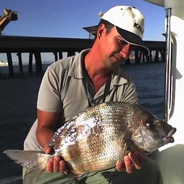 Este año sea al curricán de fondo, a jigging sea ocasionalmente pescando con volantin, usando cebo vivo o trozos de sardina o alacha, se están capturando en aguas próximas a Torrevieja, numerosos dentones.Uno de ellos, de 3,5 kg y 63 cm de talla, fué pescado a mediados de abril, por J.M. Medina a bordo del "Avizor".Tuve la ocasión de participar en la emoción de la habilidosa captura de este hermoso y bravo ejemplar pescado a fondo en 40 m. de sonda con caña fina y teminal del 0,40 de fluorocarbono. Ver bajo algunas imágenes de la misma |