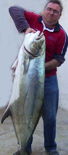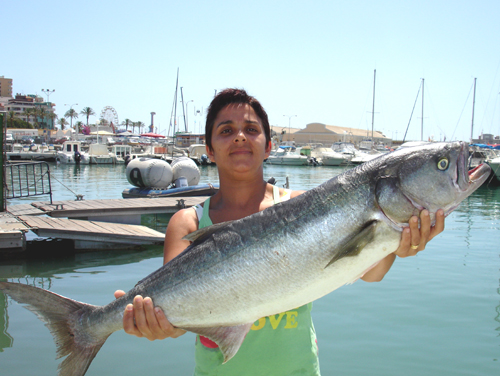 Enorme choa, o anjova, o "talla hams" (pomatomus saltator) de 92 cm y algo mas de 7 kilos, pescada al curri costero por la embarcación "CUCA 4" patroneada por Mario García Quinto, acompañado de su mujer Estefanía Tortosa quien la muestra en la foto , tomada por mí, el 29 de junio del 2008. Para mí es la mayor capturada por socios del R.C.N.T desde hace mas de 10 años, en los que llevo el archivo de récords de este Club, por lo que paso a incluirla como tal. Un ejemplar como este seguramente fue el responsable del enorme bocado que presenta al mabre de la foto-Pulse aqui Fué conseguida pescando en 15 m. de sonda utilizando como cebo un espetón con un aparejo con terminal de acero, en aguas próximas a Cabo Cervera. En ese mismo día lograron otra de dos kilos ( Ver foto inferior) |