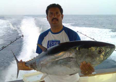![]() ![]() Atún de 32 kg capturado a bordo del Toni Dos en el verano de 2008, utilizando el señuelo que hay a la derecha. Emplearon línea de 60 libras y caña con carrete Shimano de 50 l..Fue pescado a unas 15 millas al Sur del Seco y a unas 50 millas al SE de Torrevieja |