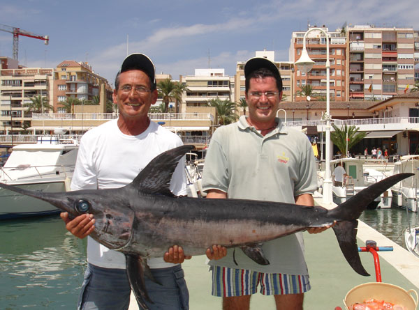 Este precioso pez espada ( Xiphyas gladius) de 34 kilos de peso, y talla: (pico del maxila inferior a horquilla de la caudal) 1,40 m., ha sido capturado hoy 31 de agosto del 08 por Manuel Blanco Albentosa -nieto e hijo de grandes pescadores de Torrevieja- y por José Mª Vivancos, -un veterano verdadero especialista en el curricán costero,- a bordo del TELOC. El precioso trofeo ha sido conseguido en un caladero de rocas submarinas de 240 m. de sonda situado a 27 Mn al SE de Torrevieja, frente a Cabo de Palos. Estaban pescando gallinetas besugos y pollos a la profundidad indicada cuando, al ir a levantar el aparejo, un tirón brutal puso sus corazones a 100. Algo realmente grande había atrapado o un taco de alacha del cebo, o lo mas probable, algún depredador había atacado alguno de los peces clavados en el volantin de fondo. Mientras su carrete recogía linea con dificultad, a veces ayudándolo con la mano y ajustando bien el freno para que no rompiera el sedal, tras cerca de una hora y media de lucha, pudieron levantar este gigantesco espada, pieza que colma con creces la ilusión de cualquier pescador apasionado . Seguro que tendrán un recuerdo imborrable de este día en el que precisamente se celebra en el Club " el dia del socio" |