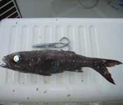Una gran pesquera hecha a bordo del "Toni dos" el 15 de Sept.08 en 450 m. de sonda. Los besugos eran todos de peso cercano al kilo (y la mayoría de alrededor de los dos kilos) como se puede comprobar en alguna de las fotos abajo insertada. Junto a ellos dos chernas , la mayor de las cuales pesó 40 kg. Se cogió ademas un pez llamado en Torrevieja "Besugo imperial" que desde luego no es de la familia de los espáridos. Reproduzco una foto bajo, enviada por Eduardo, otro de los protagonistas de la pesquera, de un gran ejemplar de esa especie perteneciente a la familia de los centrolophidos, (peces que como la cherna viven primero en aguas superficiales y luego alcanza profundidades hasta de 1 . Pulse las imágenes para ampliar |
