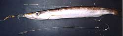 ![]() El cebo ideal es un espetón vivo, pero en su defecto las choas entran bien al espetón pasado con cable de acero mediante una aguja e insertando el anzuelo cerca de la aleta caudal tal como muestra la foto superior |