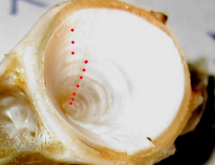 | Aunque la foto no es muy nítida, se ven los anillos claros, mas anchos, correspondientes a las estaciones del año con mas luz en las que se alimentan mejor y tienen por tanto mas crecimiento, y los anillos mas oscuros y estrechos correspondientes a los meses invernales. Un anillo claro y uno oscuro corresponde a un año de vida |