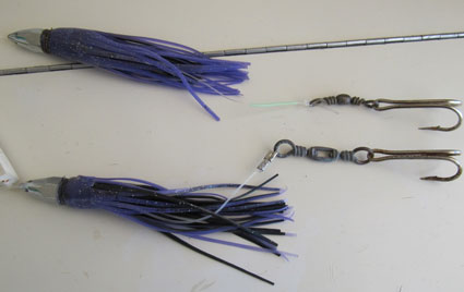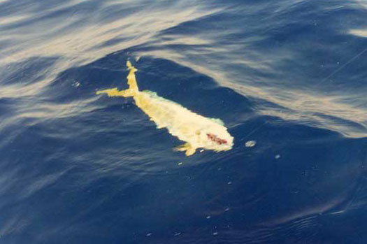 | Cerca del segundo punto señalado en el Gps, la caña de estribor se dobló mucho más que antes, hacia popa. En este momento el barco llevaba una velocidad de 7 nudos y esta vez la bacoreta era de un kilo por lo menos. Continué navegando hacia un tercer punto, con fondo rocoso y abrupto, marcado en el gps. Al poco, ví saltar a poca distancia de los excitadores, un pescado que identifiqué como llampuga. |
