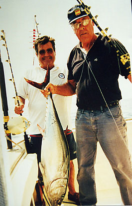 La albacora es el otro representante en aguas mediterráneas del género Thunnus ya que el otro representante, el T.Obesus o patudo, no existe en nuestras aguas, aunque si en la costa ibérica atlántica y en Canarias. El carácter diferencial mas importante es que las aletas pectorales son muy largas( tambien se le llama Germo Alalunga). Tiene una nítida separación entre el azul oscuro del dorso y el plateado del costado y vientre ,mostrando, en la zona de separación, una estrecha franja azul iridiscente. Se captura de ordinario mas allá de la plataforma continental en torno al "Seco" o en veriles de 1000 m. Entra a la bonita, a rapalas y konahead de cabezas metalicas y faldones de plumas o vinilo. Parece que le tientan mas lo colores blanco y rojo aunque también los azul y violeta. Alcanza un tamaño de 1,20 y 30 kg de peso. El que presento es el máximo capturado entre nosotros, que pesó 24,300 LISTADO o bonito de altura