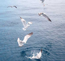 La presencia de melvas o atunes en la zona nos la señalan los charranes, pardelas, alcatraces o gaviotas, quebrando su vuelo o picando hacia el mar. A veces se ven huir, despavoridas, las sardinas o boquerones, o vemos saltar las melvas o atunes en superficie. Actualmente se pueden localizar los atunes, con las sondas modernas, de ordinario a una profundidad de 10 a 20 metros, tanto los jóvenes como los adultos, por su tendencia a seguir las embarcaciones. . Una vez localizados, les dábamos pasadas al curri lento procurando no hacerlo por encima de la zona donde se estaba cebando, sino por los alrededores de la misma. A veces, al pasar cerca veíamos que las sardinitas o boquerones se habían concentrado formando una bola apretada de color verdoso, sobre la que se lanzaba el averío. Era lo que llamábamos el "garbillo" Gaviotas, charranes, y alcatraces picaban una y otra vez tratando de atrapar alguna sardina, perseguida por debajo por los ataques fulminantes de las melvas o atunes.