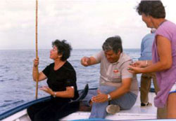 ....A medida que el barco iba navegando, se iban "abrigando", a veces, otros bancos de atunes, con lo que la pesquera podía durar horas. Sucedía a veces que, de un modo inesperado, o coincidiendo con la pérdida de algún atún, el grupo se tornaba indiferente, perdiendo su agresividad. Veíamos ahora bajo del barco, a mas profundidad, sus flancos plateados mas que sus azulados lomos. "Se ponían blancos", según expresión local, y entonces no atacaban. Para despertar de nuevo su agresividad podía dar resultado o fumarse un pitillo dejándolos un rato en paz, o dando una arrancada al barco para hacerlos subir. También era a veces muy eficaz el arrojar agua con una manguera conectada a una bomba, o el más sencillo método de echar agua a pozales para simular pececillos alborotando la superficie del mar, mientras uno de nosotros hacía brincar en superficie consistente el pececito plomado brillante o " porrillo". Al cabo de poco tiempo los atunes se " ponían negros" y agresivos arrancando las cañas de las manos a los más bisoños o rompiendo a veces los sedales con sus ataques fulminantes.