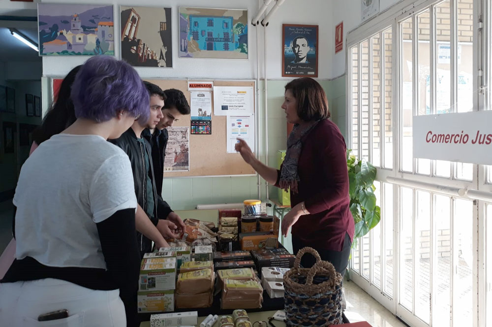 Tambien en esta ocasión , como otros años, una profesora de este prestigioso Instituto, voluntaria del equipo de Comercio Justo de Orihuela, estuvo presente, mostrando a los alumnos los productos y su origen, de este Comercio Solidario. Fruto de esta sensibilización, son varios los alumnos de cursos superiores, que acuden como voluntarios a nuestra tienda en ocasiones puntuales, compatibles con su horario escolar |