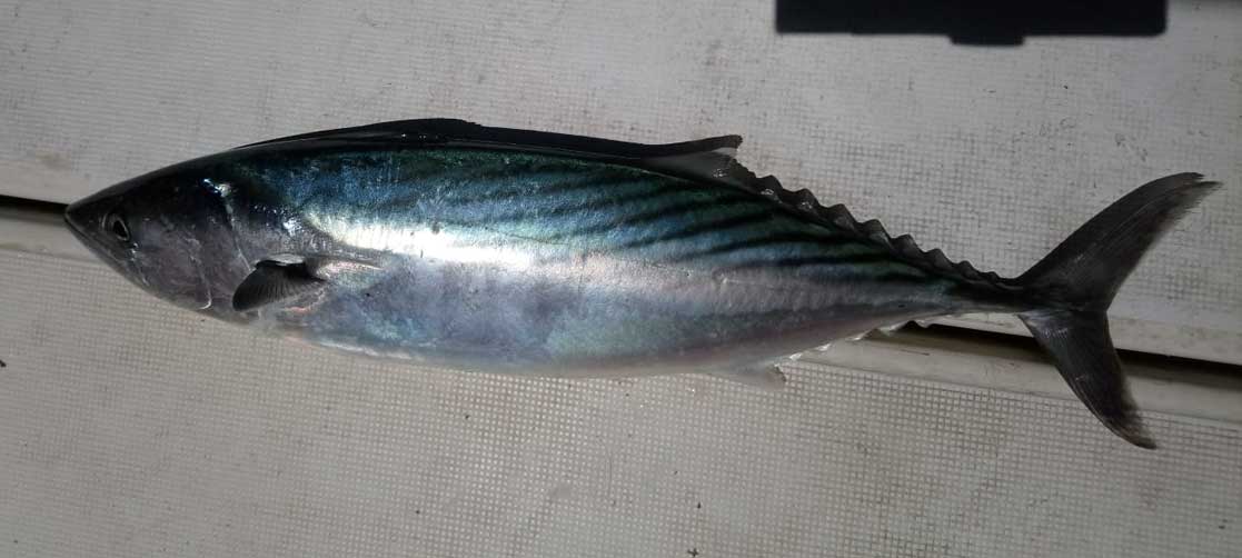 Arriba, Bonito de 1,2 Kg pescado a bordo del Pataty en aguas costeras