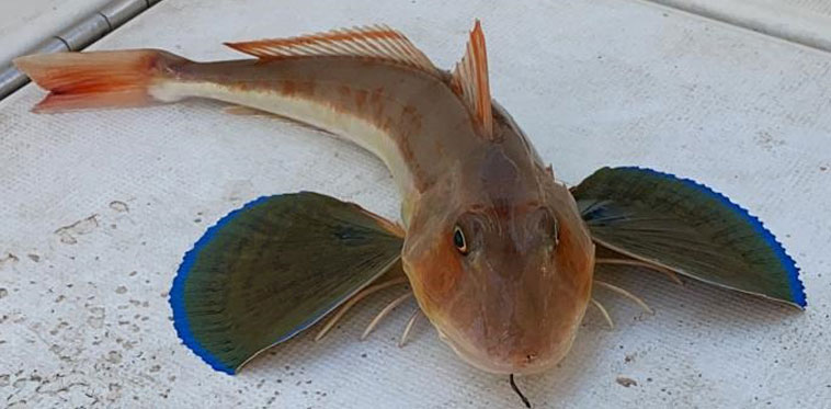 Arriba Lucerna o chirriola (Trygla Lucerna) capturada por David Terrés hijo, en 24 m de sonda , junto con 20 doradas de las escapadas de piscifactoria. Pertenece al genero de los Triglidos . Para ampliar información, pulse aquí