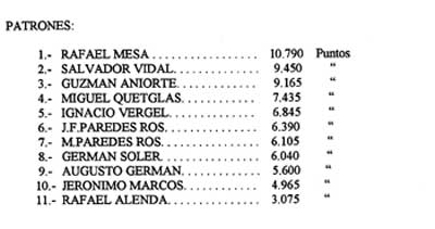 El día 1 de febrero se celebró el Campeonato Provincial de pesca en embarcación fondeada,organizado por el Real Club Naútico de Torrevieja. El estado de la mar fue bueno durante el desarrollo de la prueba, si bien empeoró a partir de las 12h. arreciando el viento de leveche (sur), aunque afortunadamente a esa hora estaba prevista la finalización. La zona elegida para la pesca fué levante, más concretamente se colocó la boya entre la 1ª de levante (granja) y la 2ª de levante, así los dos pesqueros eran válidos, oscilando el fondo entre 41 y 44m. La pesca fué abundante capturándose sobre todo una gran cantidad de raspallones y un buen número de pageles. Participaron un total de 30 pescadores (patrones incluidos) repartidos en 11 embarcaciones. Se clasificaban, para el campeonato autonómico, tres patrones (corriendo puesto los que ya están clasificados) y cinco tripulantes. Se clasificaron como patrones: M.Paredes Ros,Germán Soler y Augusto Germán. Y como tripulantes: Lázaro Ferrandez y Ángel García Arauco. El Real Club Naútico de Torrevieja es el único club que presentará 11 pescadores al campeonato autonómico, ya que a éstos hay que sumarles los seis que ya estaban clasificados que son:J.F.Paredes Ros,Ignacio Vergel,Miguel Quetglas,Guzman Aniorte,Salvador Vidal y Rafael Mesa. La clasificación final quedo así: |