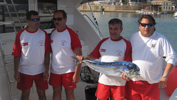 | Puntuaron también, en 4º lugar el Mª VICTORIA de Marina Internacional y en 5º el DOLPHINS de la C.Catalana , con dos capturas cada una .En 6º lugar el MANDALA de Baleares, con una captura . El único incidente , digno de ser notado, fue la avería del MOCAVA , que desde el pesquero, situado a 60 millas de Torrevieja, se volvió por sus medios a su puerto base en Ibiza . El total de la pesca conseguida en estaprimera manga ascendió a 208 kg de pescado. Vea bajo un aspecto de las capturas totales de la primera manga |