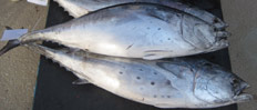 | Los barcos pescaron en dos zonas,. Una en torno al Seco de Cabo de Palos y otro grupo mas allá del Patibulo , al NE de Torrevieja . De los 16 inscritos , presentaron capturas 6 barcos, con un total de 24 ejemplares Las especies presentadas fueron las que aparecen mas bajo .De izda a dcha , Bacoretas , Bonito del norte o alalunga y atun listado.Como sabemos el atún rojo estaba prohibido |