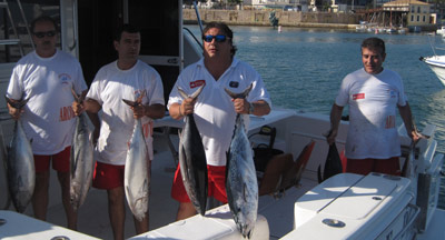 | La pieza mayor la consiguió en esta segunda manga la BLANC Y BLAU patroneada por Fracisco Artacho de la C. Valenciana con una bacoreta que pesó 14,200 con una talla de 100 cm. Dicho tamaño es de los mas grandes que se consiguen, según Bauchot y Pras, en el Mediterráneo aunque hay reporters en Fish Base que refieren tallas de 1,22 y 16,5 de peso. Aparte de todas estas capturas, hubo numerosas picadas de atunes, como las de la ARCADIA con 4 atunes de 10 a 20 kg devueltos al mar |