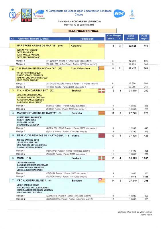 El 12 de Junio de 2016, un equipo del Club de Pesca Marina Internacional , se clasificaba el 2º en este Campeonato Nacional celebrado en Hodarribia Guipuzcoa