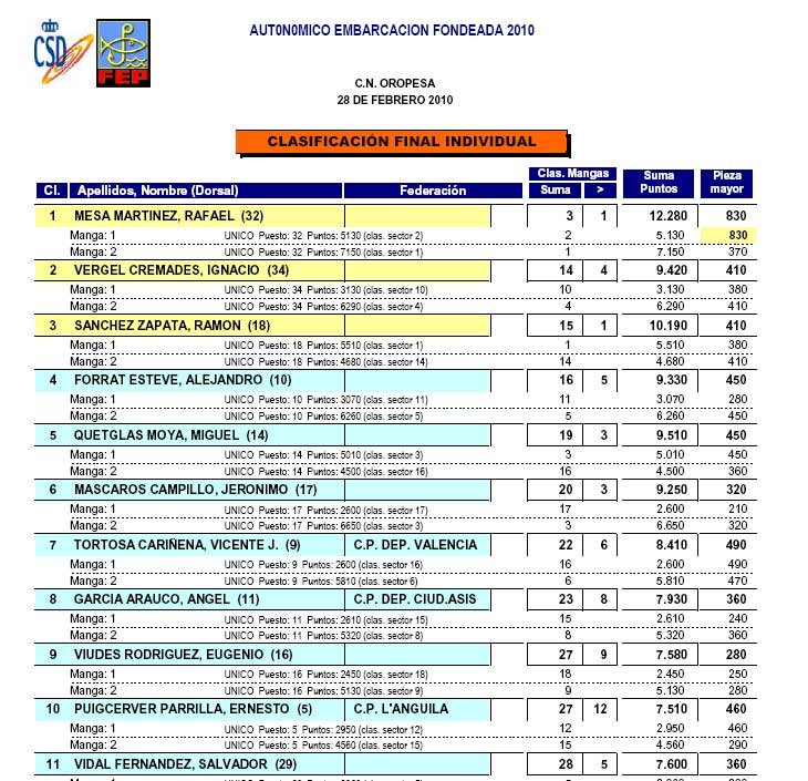 La 2ª manga se hizo un poco mas adentro en sondas entre los 38 y 40 metros. Aquí el fondo era principalmente blando, con lo que la especie que mas se pescó fueron pageles de mediana talla. La clasificación final se obtenia de sumar la posición en cada manga, de manera que ganaba el que sumara menos puntos."