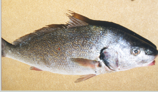 costa. Pertenece, como la corva, a los Sciénidos. Presenta la típica verruga o barbillón bajo la mándíbula inferior y tiene las típicas bandas amarillas oblícuas mucho más visibles en los ejemplares jóvenes. Este ejemplar de más de 70 cm es del tamaño máximo para la especie. |
