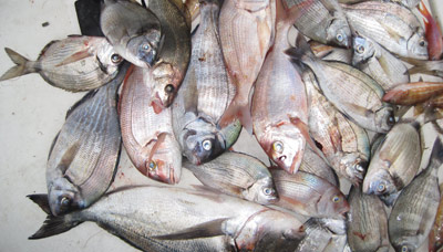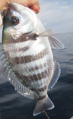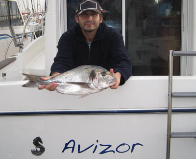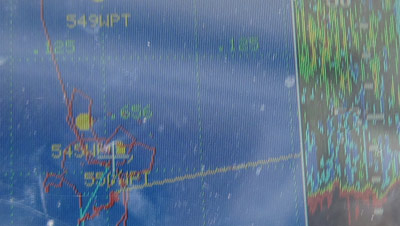 ![]() Imagen de la sonda. Abundancia de pescado encima de un piso rocoso. A la izda la localizacion en el ploter y los trayectos del barco para un correcto fondeo