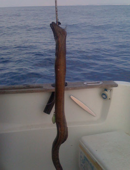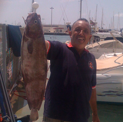 Arriba, morena o murena recién salida del agua. A la derecha otra imagen de J. Antonio con la brótola de 2,300