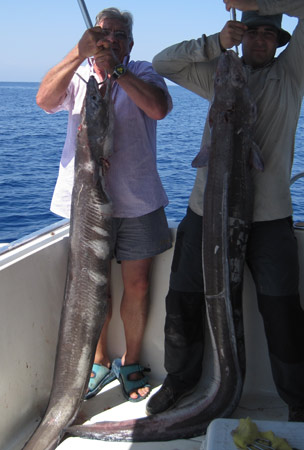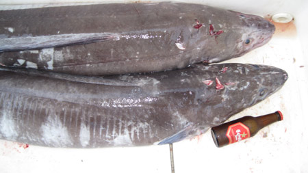 ![]() Detalle de las cabezas de los dos congrios capturados ese día de 29,5 y 20 kg y 2 metros y 1,70 de largos |