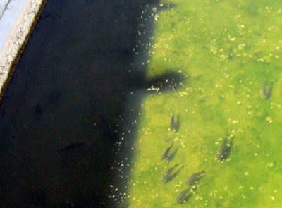 | La siguiente imágen la incluyo como curiosidad.Está tomada en el cauce del rio Segura, a su paso por Orihuela, a la altura del puente nuevo o de levante. No es muy buena , dada la turbidez del agua pero se aprecian claramente un numeroso grupo de carpas de un peso estimado entre 200 y 400 gr. Las vengo observando desde hace un par de semanas. Hoy concretamente he contado en un reducido tramo, a esta altura, mas de 50 . ! A ver si tenemos que cambiar las señas de mar por las de rio.. ! | |