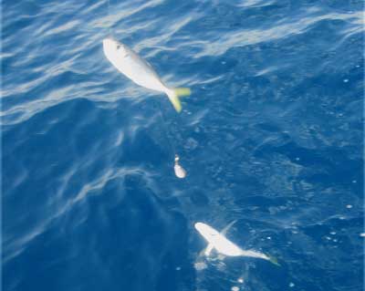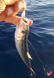 | Los jureles tenían un tamaño entre 30 y 35 cm y un peso de unos 200 a 300 gr. (Pulse aquí) pero dieron buen juego hasta eso de las 10,30, por lo que eso, unido a la calma el sol y el calor, nos empujó al embarcadero |
