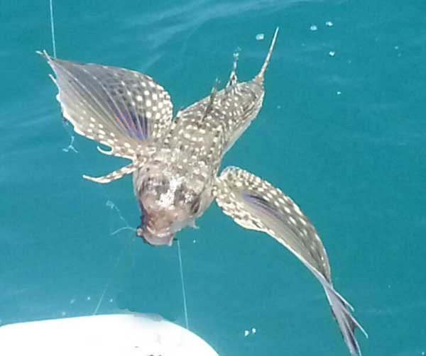 | Arriba, a la izda izando una chicharra o golondrina de mar (Cephalocanthus o Dactylopterus volitans), que luego fue vuelta al mar . A la derecha unos cuantos galanes. Pulse imagenes para ampliar . Para ver sistema de pesca , pulse aquí |