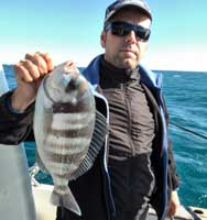 Arriba el patrón con un doblete de dorada y sorela. Vea el listado característico de este pez, motivado por el stress, recién salido de la agua. Pulse para ampliar |