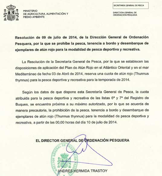 Se prohibe desde hoy dia 10 de Julio de 2014 la tenencia y desembarco del atun rojo a los barcos recreativos.
