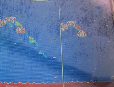 Arriba imágenes de las choas en la sonda, en este caso descendiendo desde media agua, hasta cerca del fondo, probablemente siguiendo una calada de aparejo