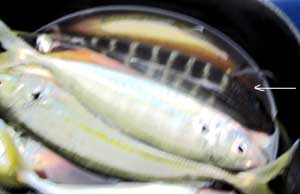 Arriba, a la izda, curioso aspecto de una sorela macho, al poco de echarla en una cofa con agua y un puñado de sorelas hembras. Vea la señalada con la flecha. Tomó momentáeamente un aspecto "atigrado" que practicamente desapareció al cogerla para lograr una mejor fotografia.Seguramente es debido a una descarga de adrenalina a consecuencia del trauma. Algo parecido sucede con atunes juveniles, bonitos , lampugas e incluso de un modo mas o menos patente en algunos pargos, pero nunca lo había obsdervado con las sorelas. Todos ellos presentan con el stress, una piel con bandas claras alternando con otras mas obscuras