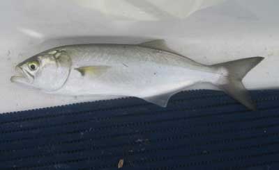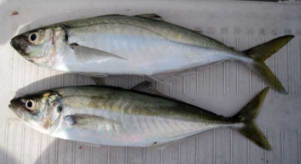 | En esta epoca, las sorelas ( Decapterus ronchus) se reúnen en puntos clave para frezar. La que presenta David, pese a su tamaño de cerca del kilo, es una hembra .El rostro de estas, es blanco, en contraste con el negruzco que presentan los machos especialmente en el morro y la mandibula inferior, (que recuerda a "un indivuduo mal afeitado y con barba negra") . Ver inmediatamente debajo |