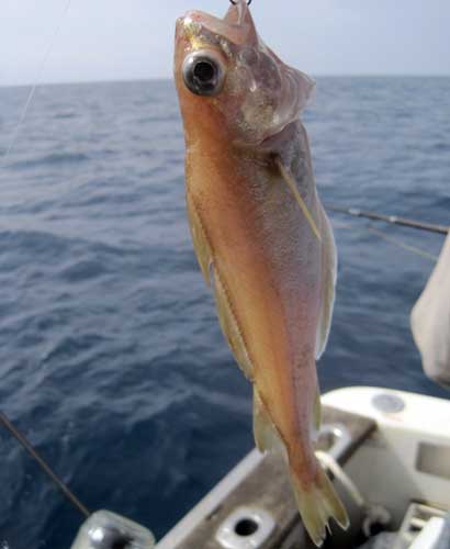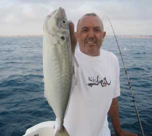 Bajo, el patrón Luis, logra la primera sorela ( Decapterus ronchus), subida a bordo del Gland, esta temporada. Por cierto , que ese día aunque las tanteamos a media agua , no dió resultado como otras veces.Bien es verdad , que no se vieron a media agua en la sonda. Los ejemplares que logramos, no muy abundantes, tenían 800 gr y 41 cm.