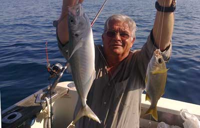 Arriba. Luis , el patrón, y a la derecha, Cesar, con las dos primeras choas. Pese a los anzuelos empatillados con cable, alguna choa, mas voraz , cortó por arriba del mismo nuestros aparejos ; o los cortaron limpiamente los que no llevaban cable fino de acero. Con todo nos hicimos, despues de faenas dicvertidas, con media docena de ellas Vea el tamaño, de 48 y 44 cm pulsando imagen de la derecha. |