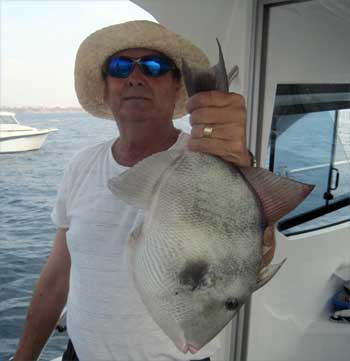 Este curioso pez, que puede alcanzar los 50 cm de largo, presentaba una malformación, o una deformidad causada por algun mordisco, quizás, de un depredador, en su epoca juvenil. Pulse aquí A la derecha, otro ejemplar capturado en otra ocasión por el autor.