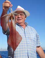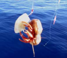 Ese día, queriendo sobretodo, pescar a fondo, no hicimos deriva, quizás por ello, los calamares que logramos fueron mas bien escasos. |